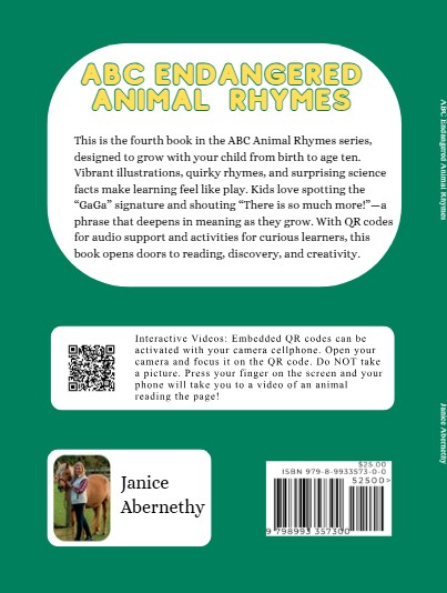 ABC Endangered Animal Rhymes introduces children to at‑risk species through playful A–Z poetry and vibrant illustrations. Each rhyme blends early literacy with real-world conservation facts, inspiring curiosity, empathy, and a love for protecting our planet’s rare and remarkable animals. A joyful, educational adventure for young explorers.